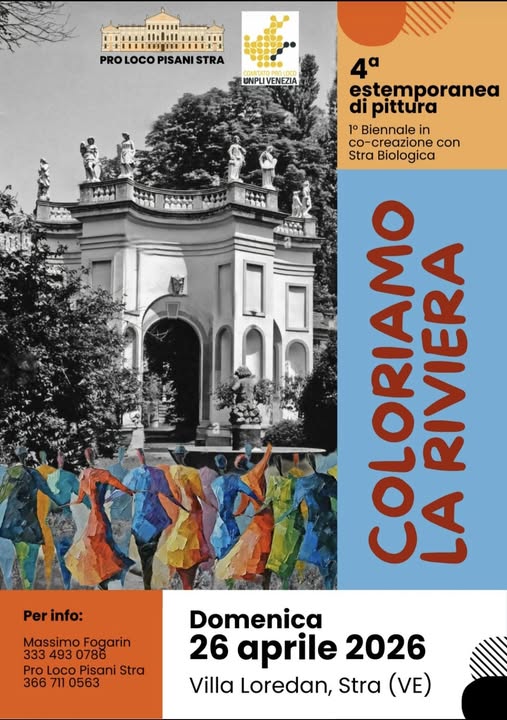 Ritorna con la biennale a Stra Venezia il 26 aprile 2026 la 4^ estemporanea di pittura” coloriamo la riviera”. Regolamento e premi veranno inviati a breve, vi aspettiamo.